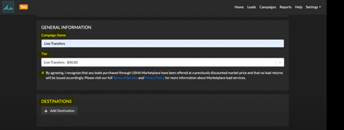 2. Create a Campaign Name, Tier Option (Live Transfer Tier), Check the box to agree to the terms, and chose a Destination option (email or CRM)