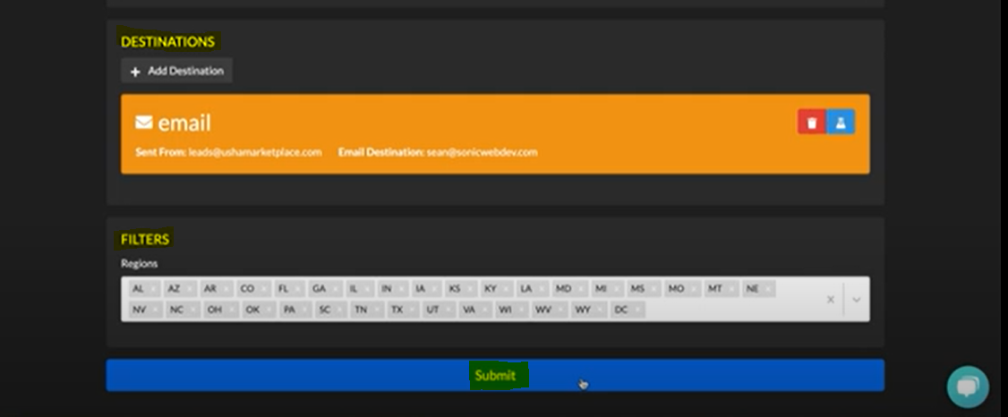 3. Once the destination option has been chosen, delete the states you wish to NOT recieve leads from. Click Submit and refresh your browser to view the created campaign.