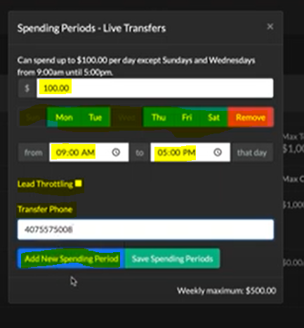 6. Set the desired amount you would like to spend on leads, choose the days you want to receive leads, set the time of day you wish to receive leads, Unselect Lead Throttle, Then Enter the phone number you want the leads to be routed to, and finally click Save Spending Period.
